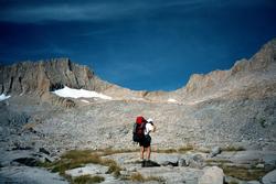 The east side is of extraordinarily loose rock. The steep, diagonal chute is bad and so is the whole slope down to the lake (we take refuge on the snow for a ways).