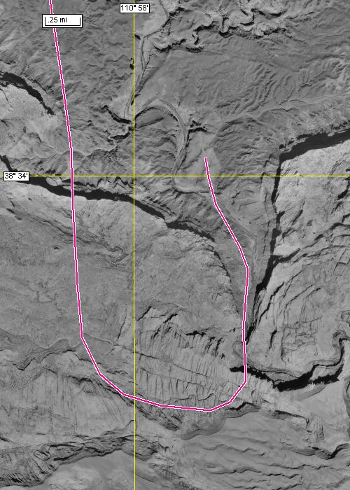 4/10 - Flight Lesson with Lary NewbySunday morning I head up to Price to pick up Larry Newby of Redtail Aviation. Larry estimated it was a half hour flight. Once in the air I find a headwind and I begin to doubt that I have enough gas so I divert to Green River to fill up. Larry's a big fellow with a huge enjoyment of flying the Utah back country. He tests me out with some steep turns in a canyon to look at an old ranch. I ask him where we are allowed to land and he tells me its pretty open down here. There are a lot of old landing strips but most times straight sections of county roads end up being the best landing sites. We first stop at Mexican Mountain, approaching from the south east. We are flying down below the canyon rim but the canyon is wide and I feel comfortable doing this. My biggest challenge is touching down exactly where I intend. These runways are narrow, with little room for lateral error. I'm a little off to the left on this landing but mostly stopped by 2/3s of the way to the end. We also land at Hidden Splendor, which has an interesting approach. Two vertical cliff walls come together in a V shape, pointing south. Muddy creek flows out the southern point of the V, forming a deep, narrow, and twisting canyon. The Hidden Splendor landing strip is in that V. To the north there is open, gently rising terrain. To the south the cliff walls converge into the Muddy Creek's canyon. You can approach from either direction. Approaching from the north is easy but the go around is difficult: you have to turn around in the tight apex of the V. The south approach is done in the canyon. This is more challenging but the go around is easier. The runway slopes up to the north. To add interest it has cliffs on both ends and large drop offs to either side. It is, at least, long. Larry, of course, prefers the canyon approach. The wind is from the north so the south approach is preferred. Larry talks me through the approach. In the down wind leg you fly over one cliff of the V and follow descending terrain. Base turn is made into a side canyon. I later realize that this is "The Squeeze", AKA Seger's Hole, a canyon I descend at the end of this trip. Larry says that in calm conditions he usually flies the base leg below the rim of this little canyon. We have a lot of turbulence and I'm not comfortable flying that low. Turning to final we pass over a low point in the rim and drop into the larger canyon of Muddy Creek. The north wind is getting pinched into this canyon and flowing up out of it. I apply full flaps and point the nose down but the plane is slow to descend. We fly first near the right wall, back to center, then near the left to line up on the runway. I'm well on center and roll to a stop at the mid point. Below is my GPS track of this approach laid over aerial photos. Below that is a sequence of pictures shot by Jeff on latter approach. On later approaches I mistakenly flew my base leg over the canyon north of Seger's Hole. This generally worked out fine, but left me a shorter distance for descent to the runway.